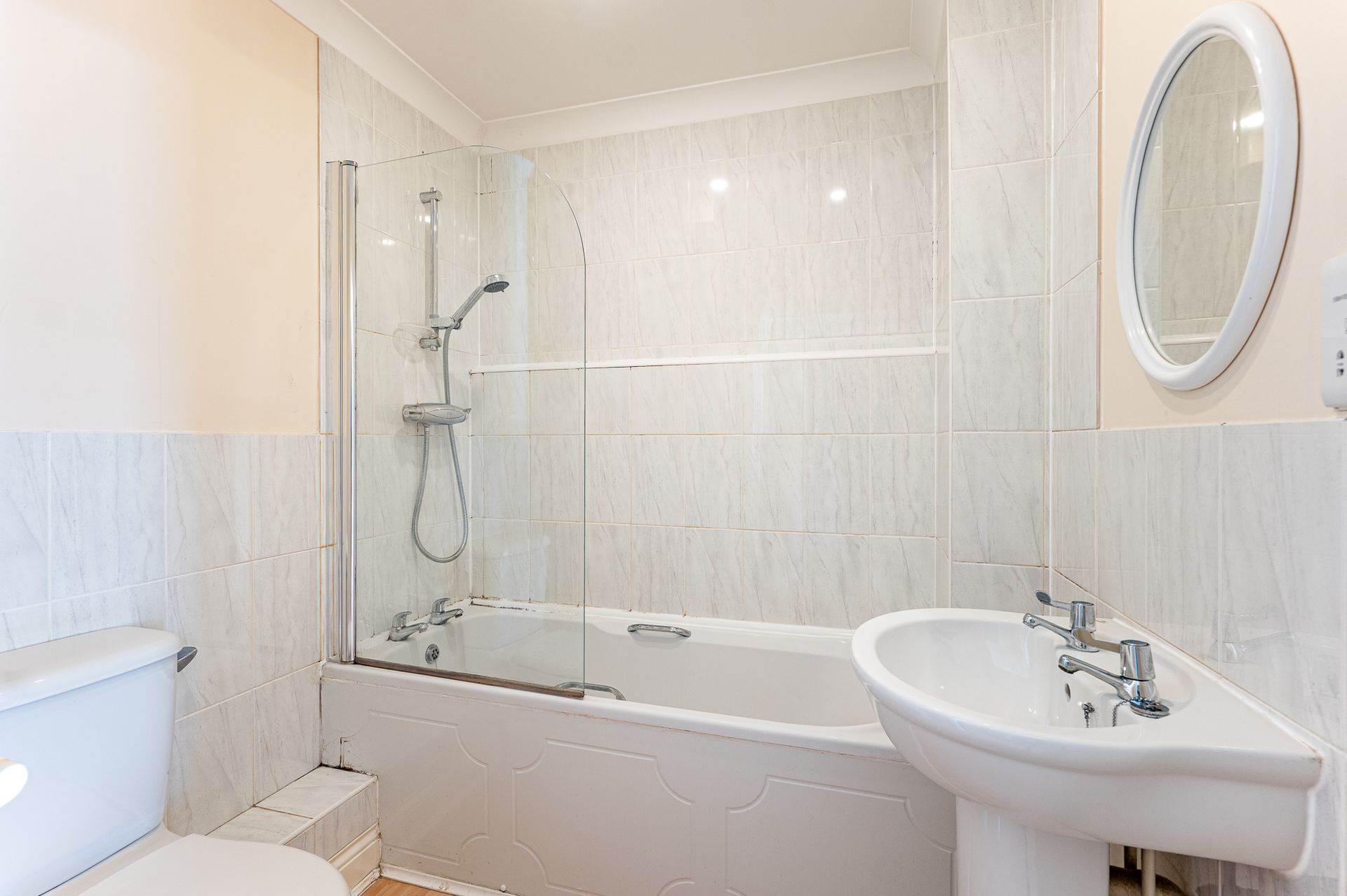 - Bathroom with shower over the bath