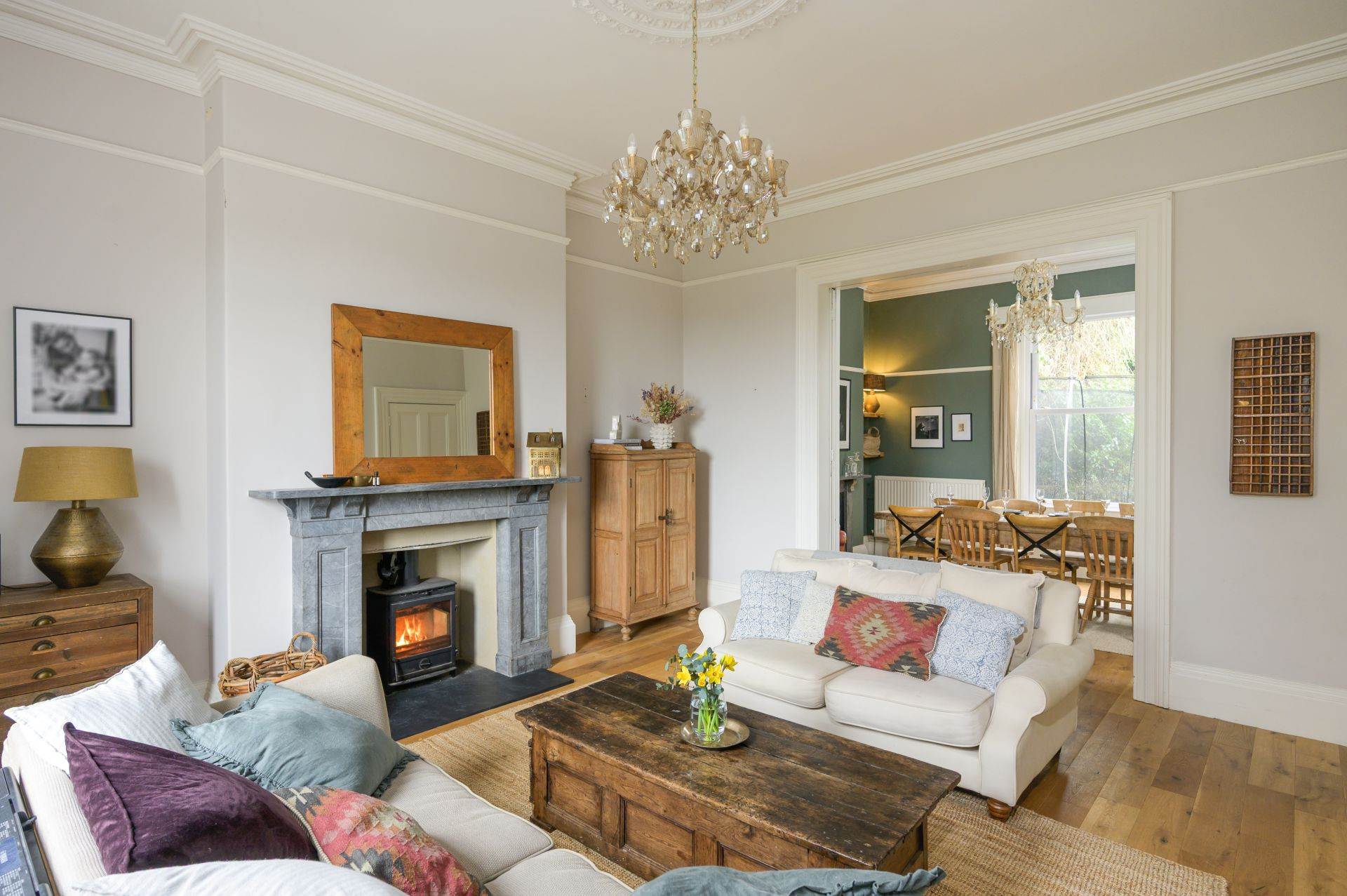 • Sizeable living room with high ceilings, a bay window and a log burner